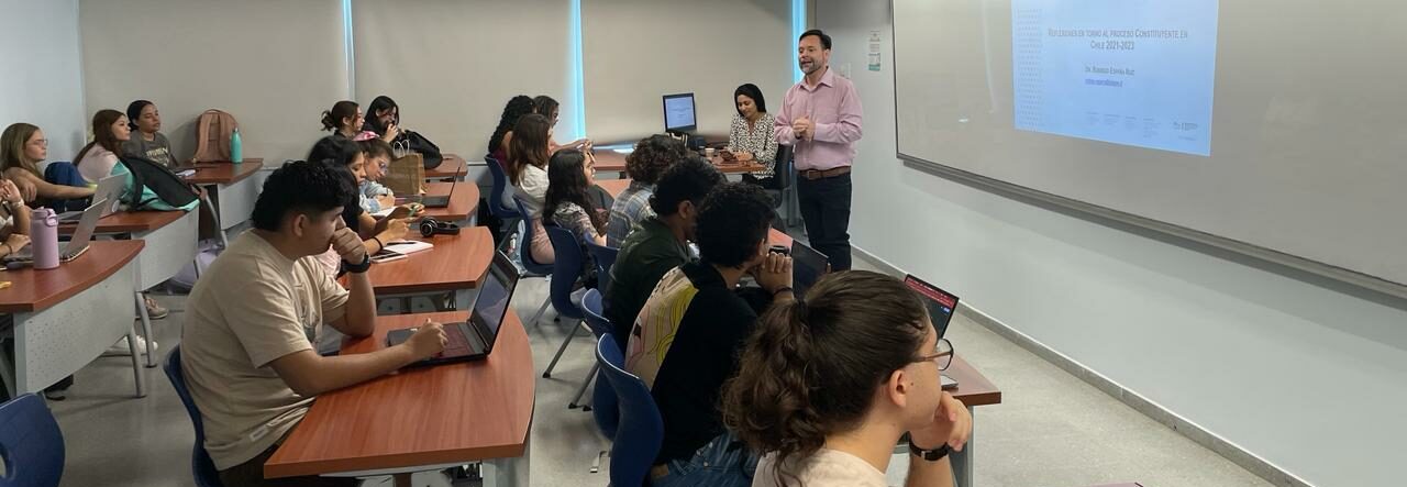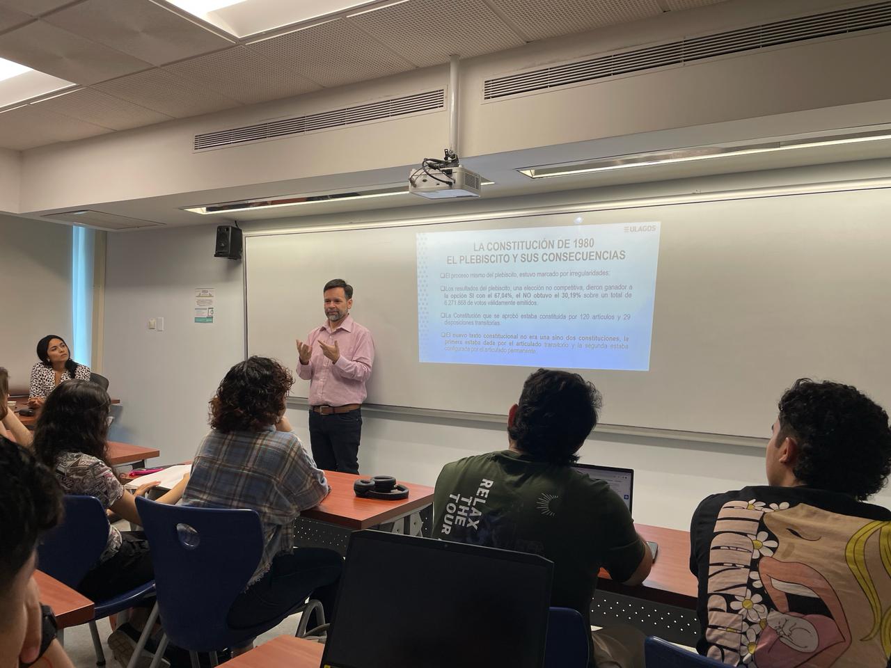 En primera instancia, el académico presentó a los estudiantes la conferencia “Reflexiones en torno al Proceso Constituyente en Chile 2021-2023”, la cual tenía por objetivo exponer los antecedentes, contexto e implicaciones respecto del proceso constituyente que vivió Chile en los últimos años. Lo anterior desde una perspectiva crítica.