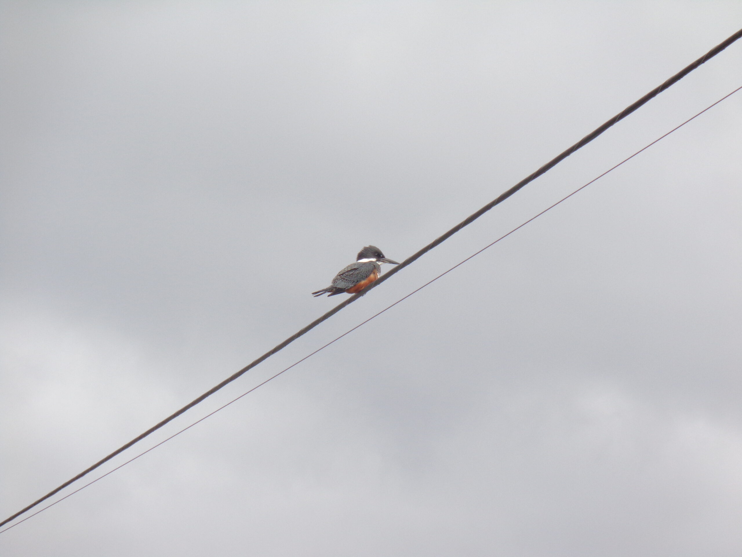 A poco llegar, un Martín Pescador (Martina porque tenía el pecho rojo, que la diferencia de los machos) se asomó a mirar los visitantes. Fue amable y se paró en un cable eléctrico para ser fotografiada, porque en el caso de Bandurrias, Pato Real, Gaviotas, Jotes y Diuques, para verles hubo que adentrarse un par de kilómetros caminando en el barroso suelo de la costa, con oscuras nubes amenazantes en el cielo y en compañía de los – aún más entusiastas – perros del sector.