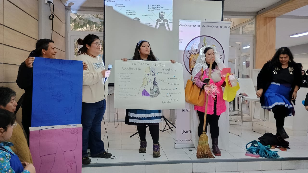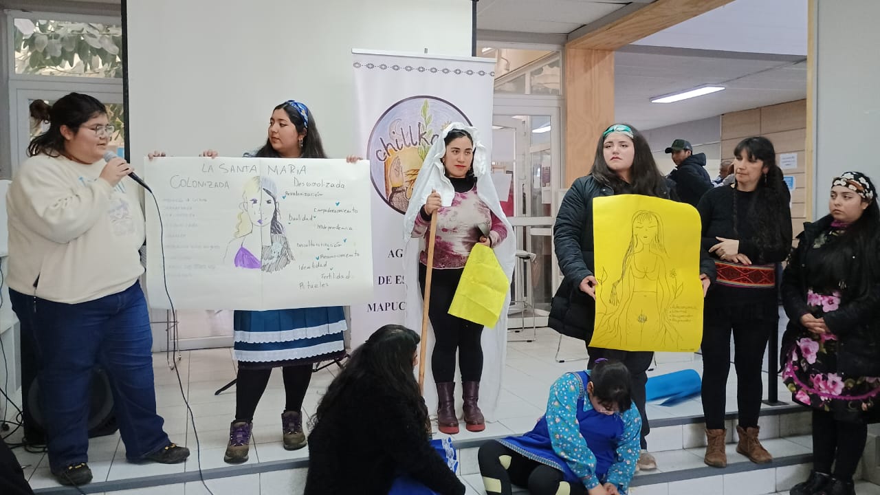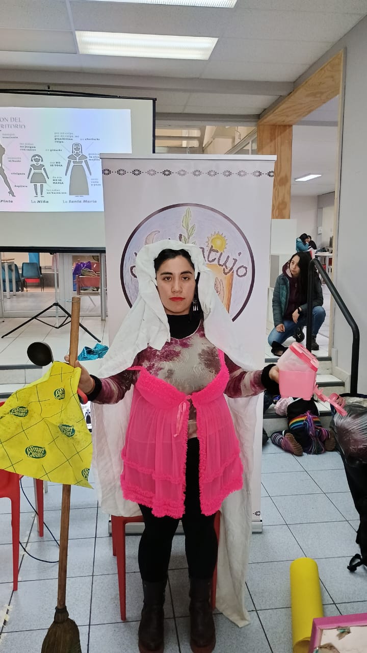 “Un maniquí, representando a la niña huinca, después la Pinta, la adolescencia, en que surge el maquillaje, los zapatos, tacos y finalmente la Santa María, la mujer adulta, con guagua, haciendo labores de casa. Todo enfocado como una crítica y llamado a la reflexión, y cómo esas estructuras, muchas veces no cumplen con nuestra realidad, con nosotras, que tenemos estructuras diferentes”, enfatizó Alejandra Alcafus, estudiante de Derecho ULagos y secretaria de la Agrupación de estudiantes Chillkatujo ULagos mo” de la Universidad de Los Lagos.