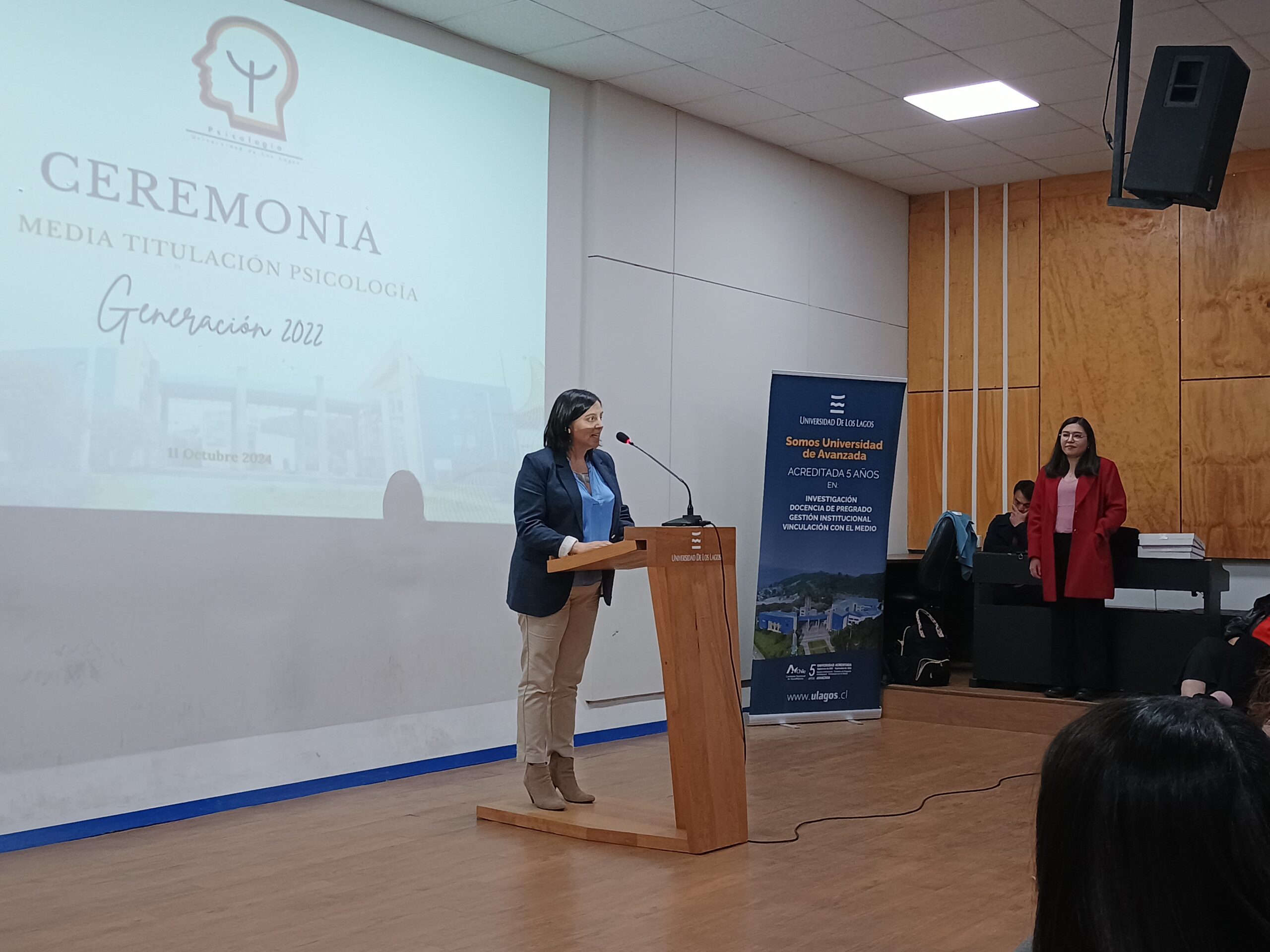 Anita Dörner, vicerrectora del Campus Puerto Montt apuntó al sello de excelencia de quienes se forman en la Universidad de Los Lagos. “Ustedes deben perfilarse como los mejores profesionales de la región. En Psicología es importante trabajar en equipo, porque a las personas se les debe tratar desde una perspectiva integral, contribuyendo desde cada disciplina con lo que cada uno tiene, con lo que sabe, con los valores que trae, con el convencimiento de querer hacer las cosas bien”, puntualizó la autoridad universitaria.