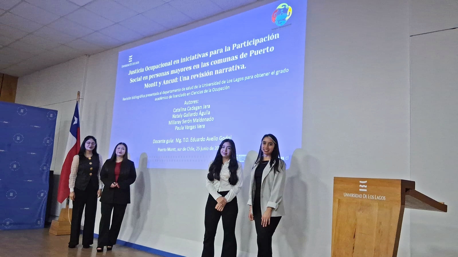 “Evidencias sobre el uso de pantallas en el desarrollo del juego en niños y niñas de nivel parvulario bajo la mirada de la terapia ocupacional: una revisión sistemática”; “El impacto de las terapias en la naturaleza para el bienestar emocional en estudiantes universitarios: revisión sistemática desde Terapia Ocupacional”; y “Justicia Ocupacional en iniciativas para la participación social de personas mayores en las comunas de Puerto Montt y Ancud: una revisión narrativa”, fueron los títulos de los proyectos de tesis de Constanza Vargas, Anaís Villarroel y Constanza Villegas; Bárbara Alarcón, María Lebil, Carla Mansilla, Alejandra Quezada; y, Catalina Cadagán, Nataly Gallardo, Millaray Serón y Paula Vargas,  segunda generación de estudiantes de cuarto año de la carrera de Terapia Ocupacional en obtener el grado de Licenciado en Ciencias de la Ocupación.