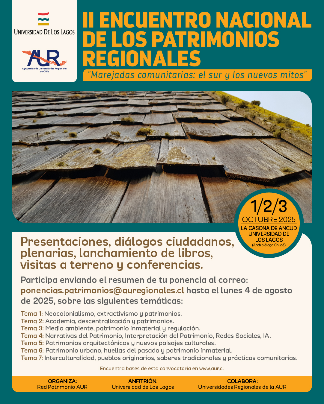 Siete serán las temáticas bajo las cuales, las y los interesados podrán presentar ponencias para participar en el II Encuentro Nacional de los Patrimonios que impulsan las universidades regionales y que, este año, tendrá como anfitrión a la Universidad de Los Lagos en el Archipiélago de Chiloé.