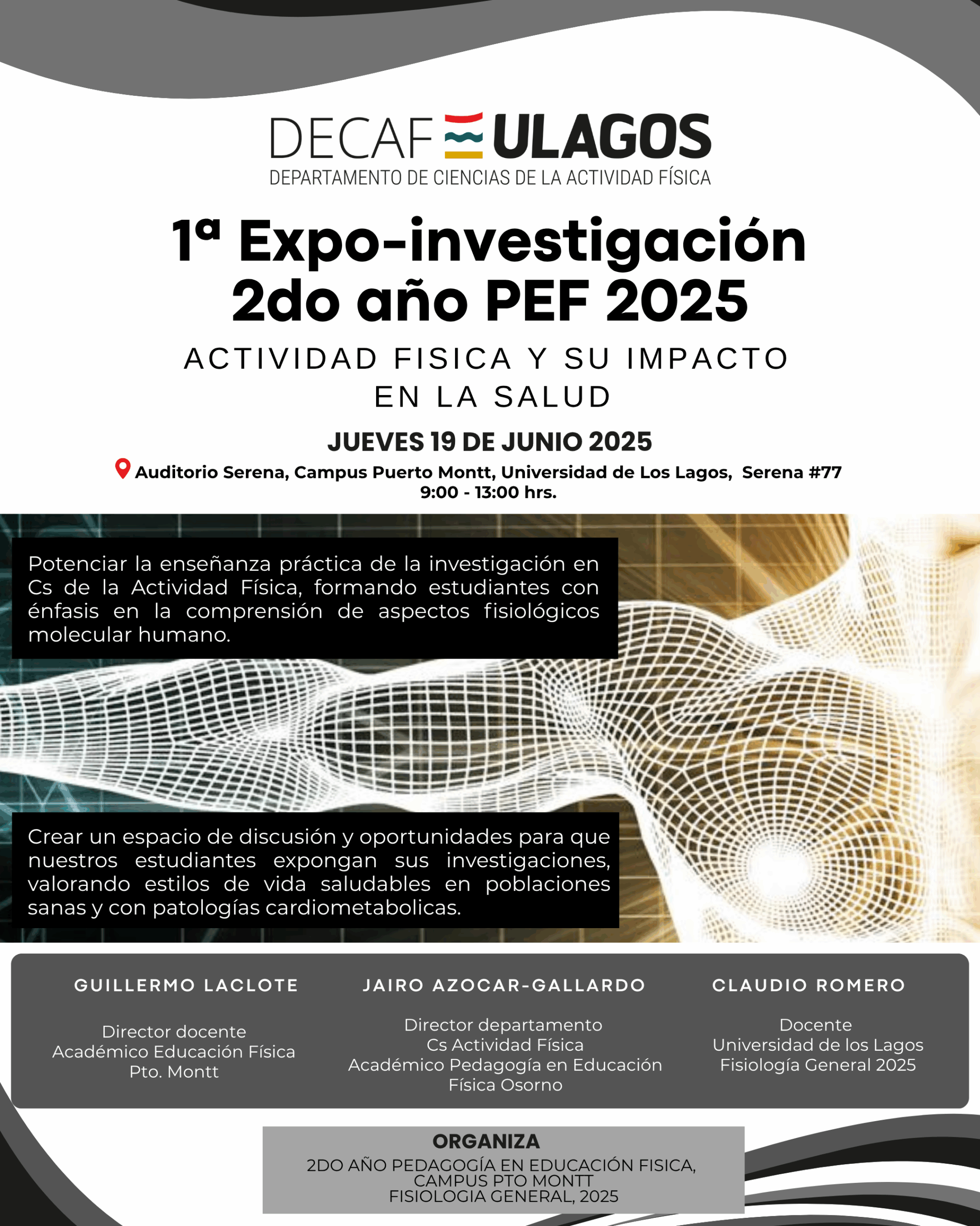 Con el fin de fomentar la investigación aplicada en el área de las ciencias de la actividad física, promover la comprensión de los aspectos fisiológicos y moleculares del cuerpo humano relacionados con la actividad física y asimismo, generar un espacio de diálogo en torno a la importancia de los estilos de vida saludables en poblaciones sanas y con patologías cardiometabólicas, se realizó la 1° Expo-Investigación de 2° año de Pedagogía en Educación Física en el Campus Puerto Montt.