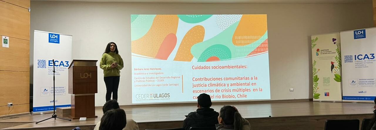 Durante su ponencia, la Dra. Jerez analizó los cuidados socioambientales surgidos en comunidades rurales de la cuenca del río Biobío, donde confluyen los impactos del cambio climático y las actividades extractivas. La investigadora profundizó en la manera en que estos territorios —precordillera, secano y costa— han articulado formas comunitarias de resguardo territorial que aportan a una justicia climática situada, desde una perspectiva local y decolonial.