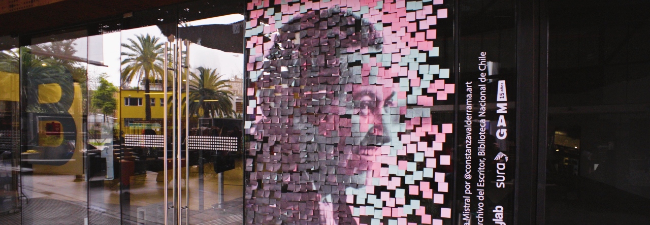 Las notas post-it, como una materialidad simple y cotidiana, se transforman —gracias a sus connotaciones simbólicas como recordatorios— en un gesto de memoria y conmemoración al cruzarse con el lenguaje fotográfico. A su vez, la multiplicidad de post-its alude a un retrato construido desde la masividad y lo colectivo, hacia el cual se ha proyectado el legado de Gabriela Mistral. En palabras de la artista, el montaje de la obra es también un proceso profundamente pictórico: “desde la cercanía construyo desde los fragmentos, como si compusiera con manchas, pero necesito tomar distancia para ver cómo aparece la imagen total. Para mí ha sido un honor realizar este homenaje en un espacio democrático y cargado de historia como lo es el GAM, donde la obra dialoga con un público muy transversal y diverso, además de estar dispuesta a posibles intervenciones también por parte de los mismos”, señaló Constanza Valderrama.