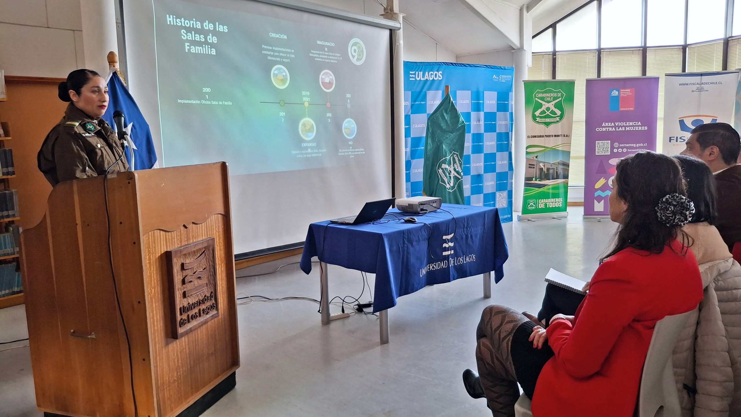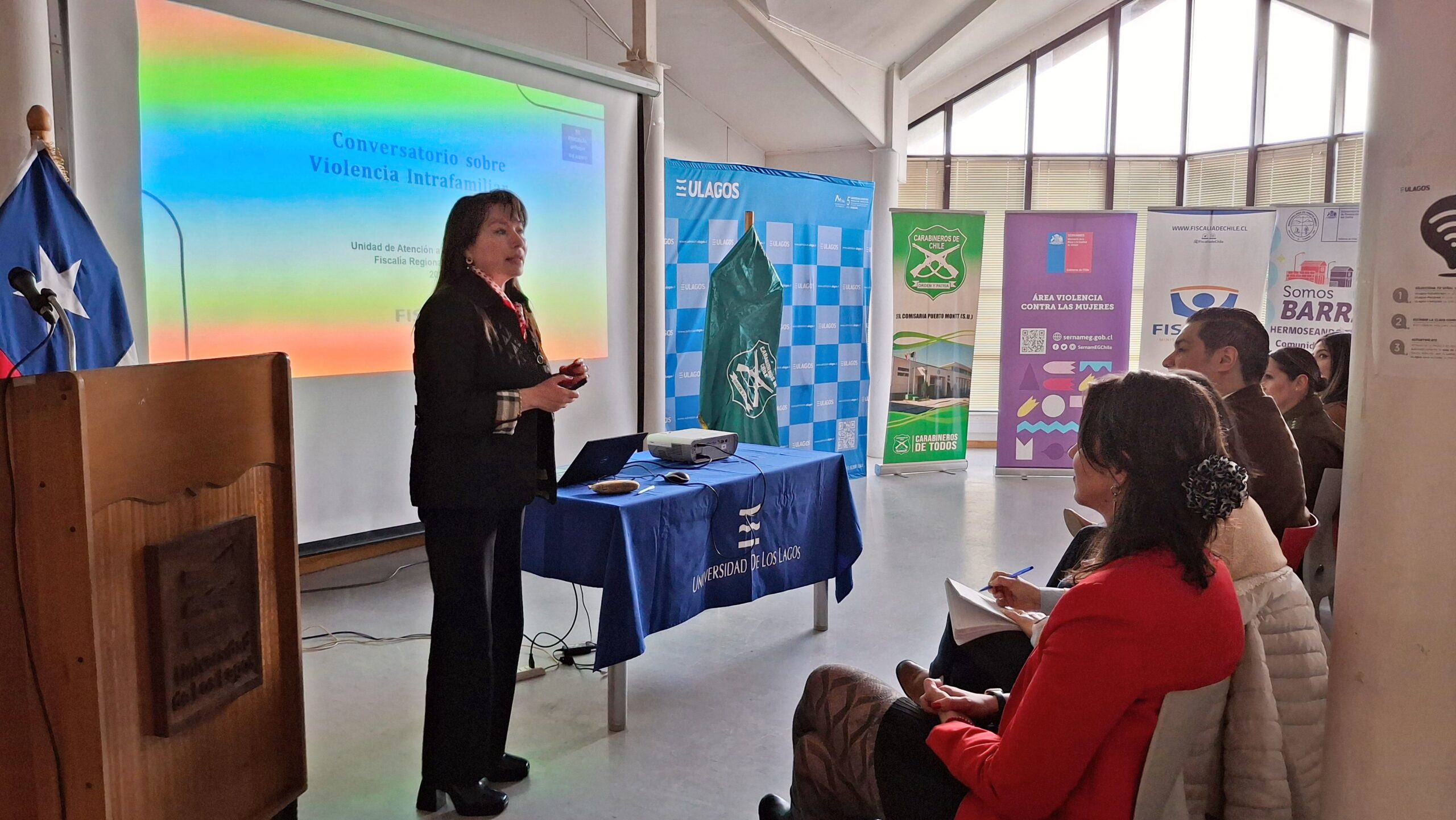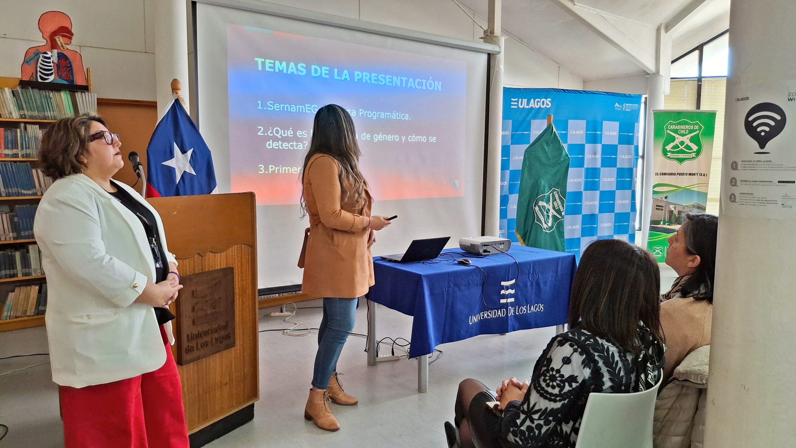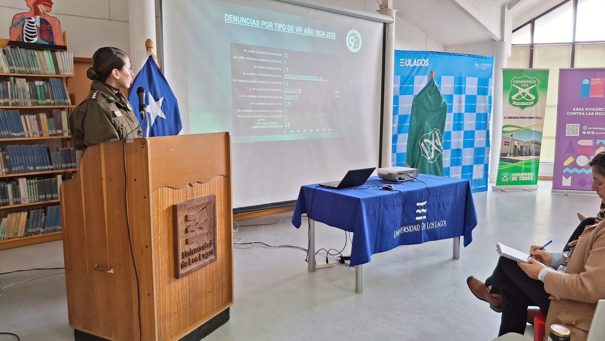 La Universidad de Los Lagos, en conjunto con la Quinta Comisaría de Carabineros de Puerto Montt y el Servicio Nacional de la Mujer y Equidad de Género (SERNAMEG), realizaron la “Primera jornada de sensibilización en violencia intrafamiliar (VIF)”, en la biblioteca de las dependencias universitarias ubicadas en calle Quellón 203. Esta actividad colaborativa tuvo como objetivo promover la prevención de la violencia intrafamiliar, generando conciencia en la comunidad sobre la importancia de construir relaciones familiares basadas en el respeto, el diálogo y la no violencia.