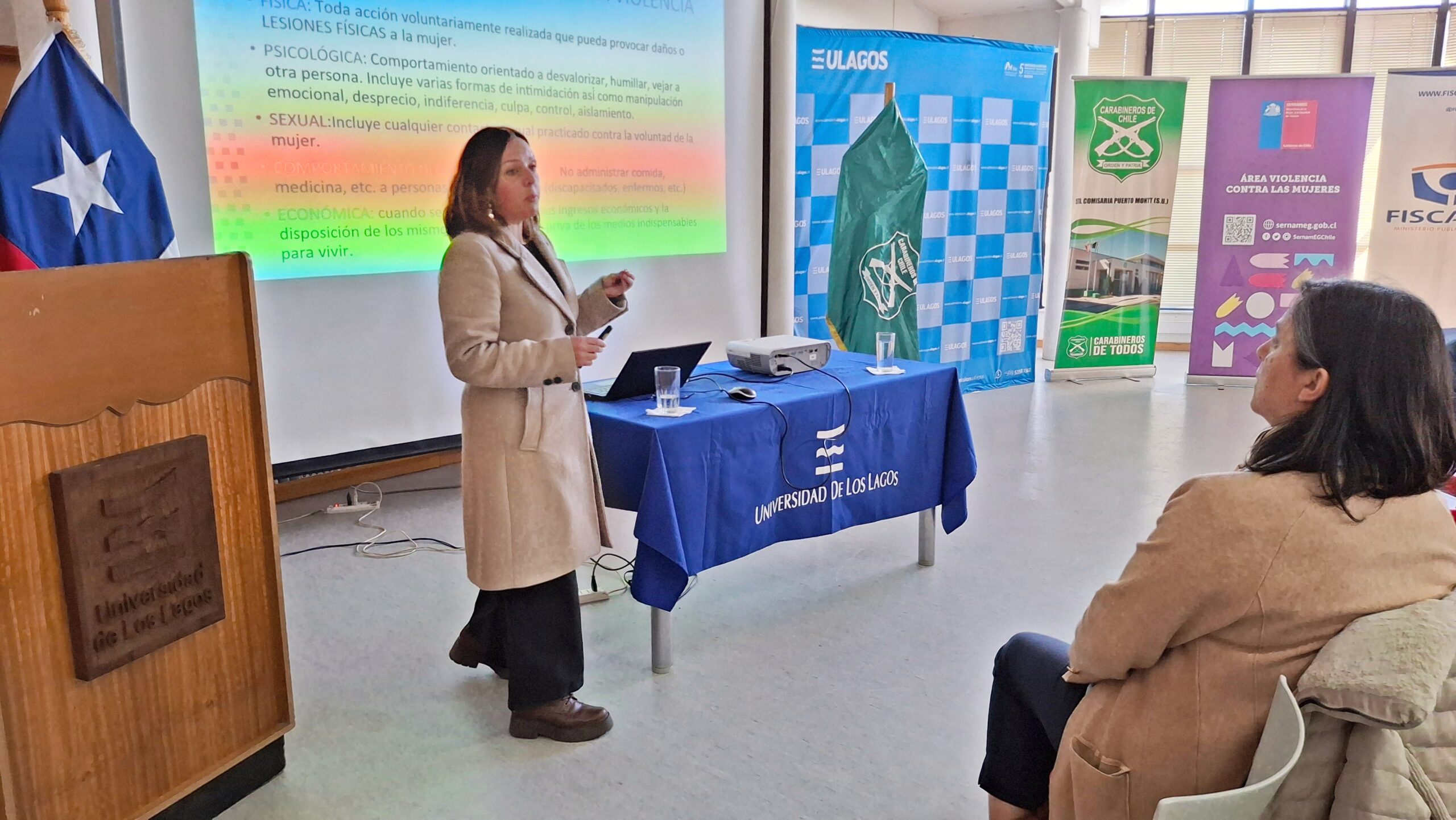 Las ponencias, estuvieron a cargo de Carabineros, con la exposición: “Sala de Familia, primera Acogida, Estadísticas Locales y denuncia Oportuna”; la Fiscalía Regional de Los Lagos expuso sobre la “Violencia de Género”; el Servicio Nacional de la Mujer (SERNAMEG) con: “Violencia de Género y Prevención”, y la carrera de Psicología de la ULagos de la mano de la académica Astrid Mancilla Soldán, con la exposición: “Primeros Auxilios Psicológicos”.