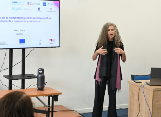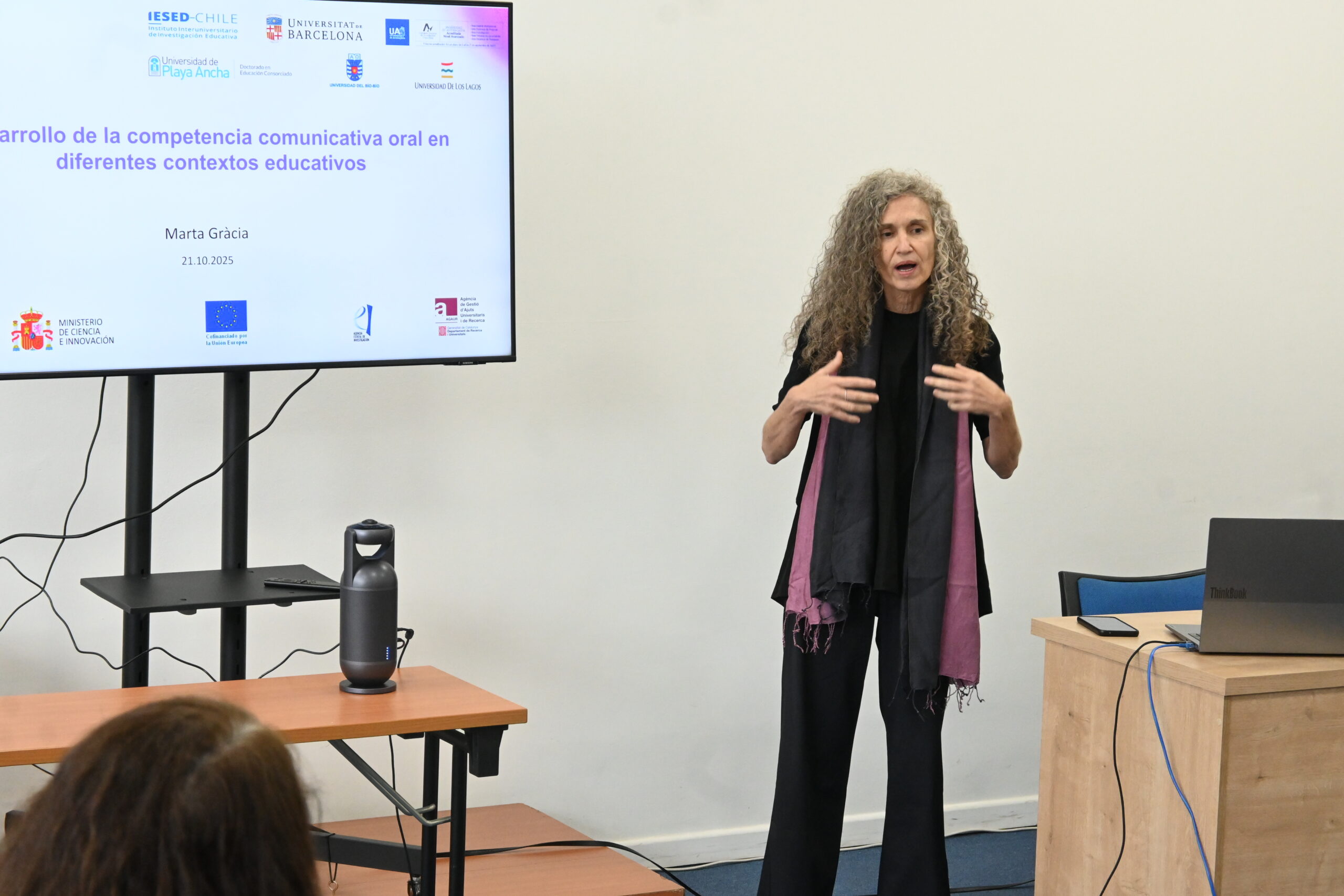 • La académica de la Universidad de Barcelona, Marta Gràcia García, participó como conferencista principal en una actividad organizada por el IESED-Chile y la Sede Santiago de la Universidad de Los Lagos, destacando el rol del lenguaje como eje transversal en todos los niveles educativos.
