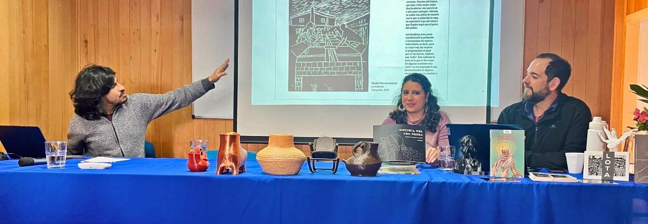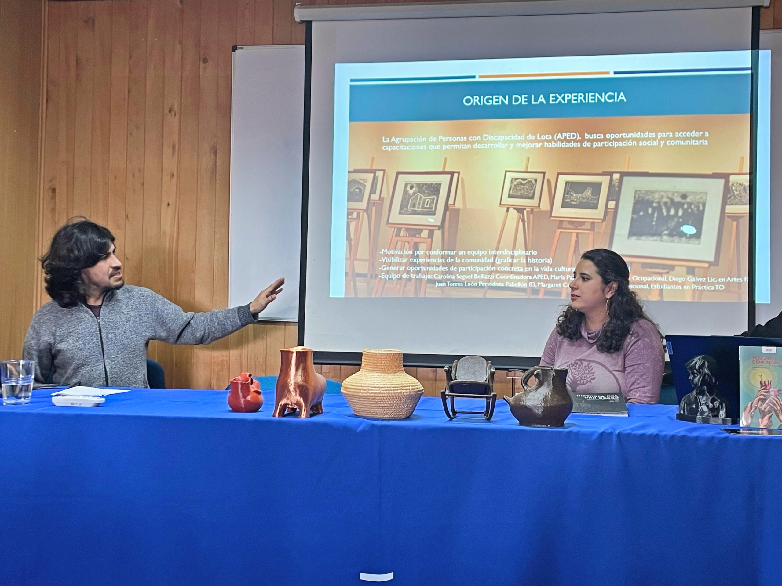 La académica de la carrera de Terapia Ocupacional, María Paz Sepúlveda, y el artista docente de Pedagogía en Artes Visuales, Diego Gálvez, realizaron una ponencia, donde presentaron su trabajo de xilografía inclusiva que realizaron en la comuna de Lota.