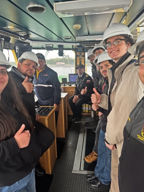 Por otro lado, el estudiantado de Transporte Marítimo Costero, visitó el puente de navegación. Los y las estudiantes tuvieron la oportunidad de estar ubicados por dos horas en el puente de navegación de los transbordadores de conectividad Chacao-Pargua, pudiendo observar directamente maniobras de atraque en las rampas, evaluación de condiciones de navegabilidad y las diferentes corrientes que presenta el canal, maniobras de carga y descarga por medios terrestres, estabilidad, situarse en la carta náutica, seguridad del personal abordo, sistema de comunicaciones, entre otros.