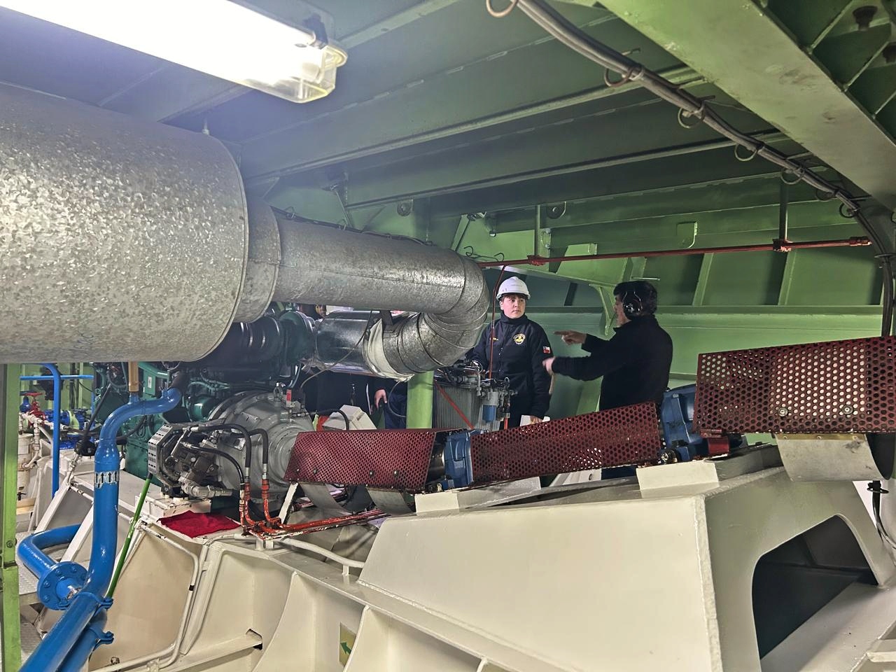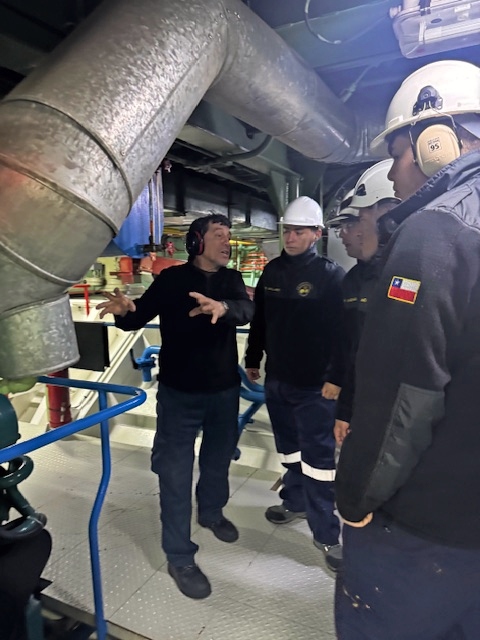 Tristán Mora director docente de Electromecánica Marítima junto a sus estudiantes, futuros motoristas, estuvieron en la sala de máquina, donde conocieron motores propulsores (Sistema Schottel), los diferentes grupos electrógenos, sistema de agua, la sala de control de motores desde donde el oficial monitorea el funcionamiento de los equipos que le permite verificar frecuencia, voltaje, controles de temperatura, entre otros.