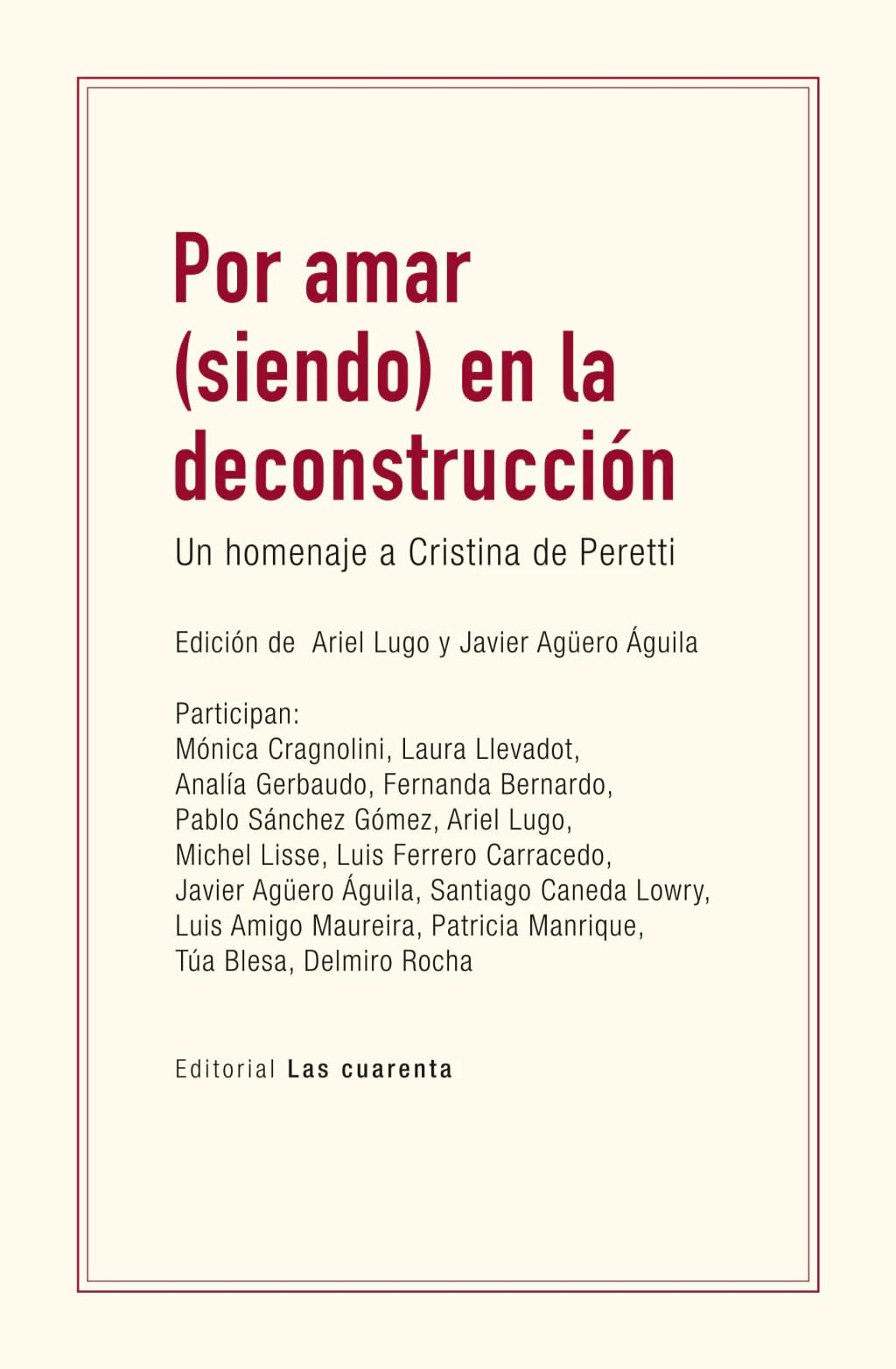 Ambos libros giran en torno a la filosofía de la deconstrucción iniciada por el filósofo argelino Jacques Derrida. El primero de ellos, titulado Por Amar (siendo) en la deconstrucción, es un homenaje –en el que participan destacados filósofos/as de Francia, Argentina, Chile, Portugal y España– a Cristina de Peretti, la principal traductora de la obra de Jacques Derrida al español y una de las máximas representantes del pensamiento del autor a nivel mundial. El texto es compilado y editado junto al filósofo argentino Ariel Lugo y, según Javier Agüero Águila, “Representa un acto de justicia pendiente hacia una pensadora y traductora de una enorme generosidad y trascendencia; la misma que le permitió al mundo de habla hispana, que en su momento no leía ni hablaba francés, ingresar a la filosofía de Derrida, a los archipiélagos infinitos de su pensamiento”, profundizó.