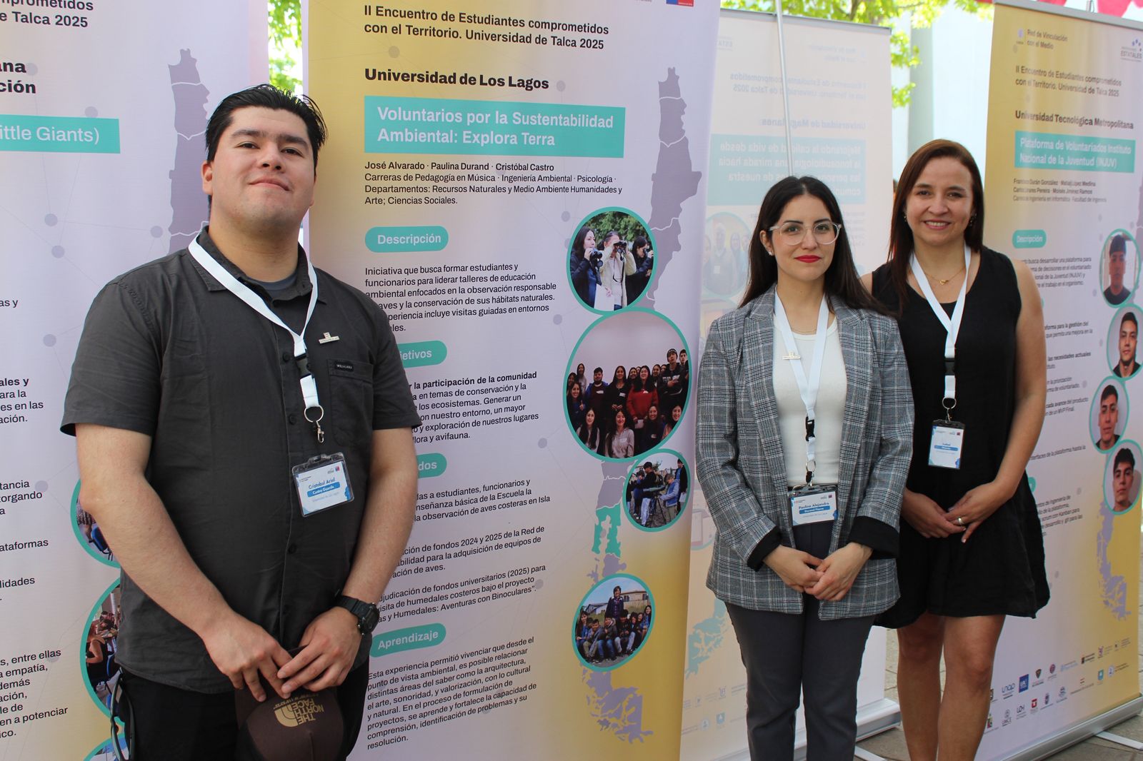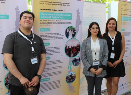 En la instancia, Paulina Durand (Psicología) y Cristóbal Castro (Ingeniería Ambiental) representaron a la ULagos presentando el proyecto “Explora Terra”, cuyo propósito es promover la participación de la comunidad universitaria y de las comunidades del entorno en la conservación y valoración de los ecosistemas.