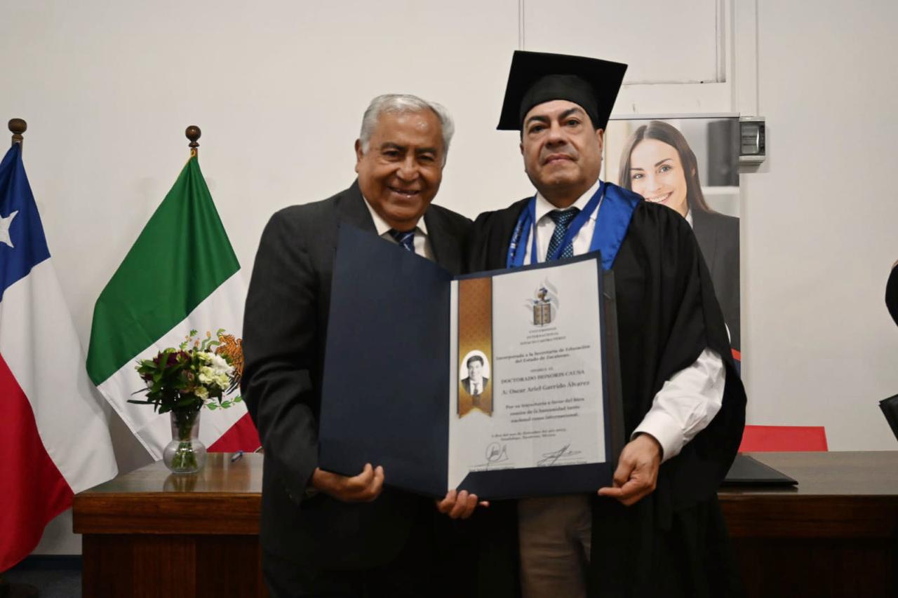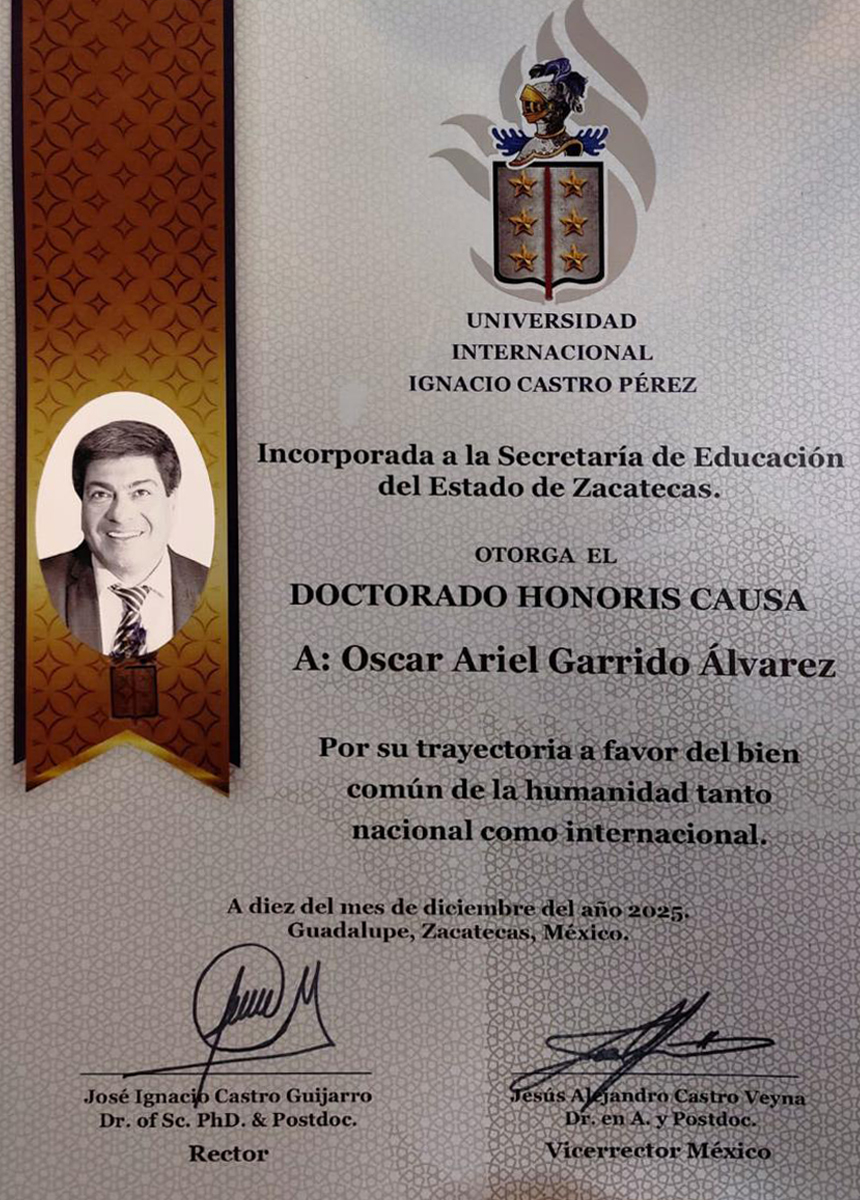 La Universidad Internacional Ignacio Castro Pérez, incorporada a la Secretaría de Educación del Estado de Zacatecas, otorgó oficialmente el grado de Doctor Honoris Causa a Óscar Ariel Garrido Álvarez, destacando su trayectoria a favor del bien común de la humanidad, tanto a nivel nacional como internacional, consolidando así un reconocimiento que refuerza su liderazgo universitario y su compromiso con la educación pública y el desarrollo de América Latina.