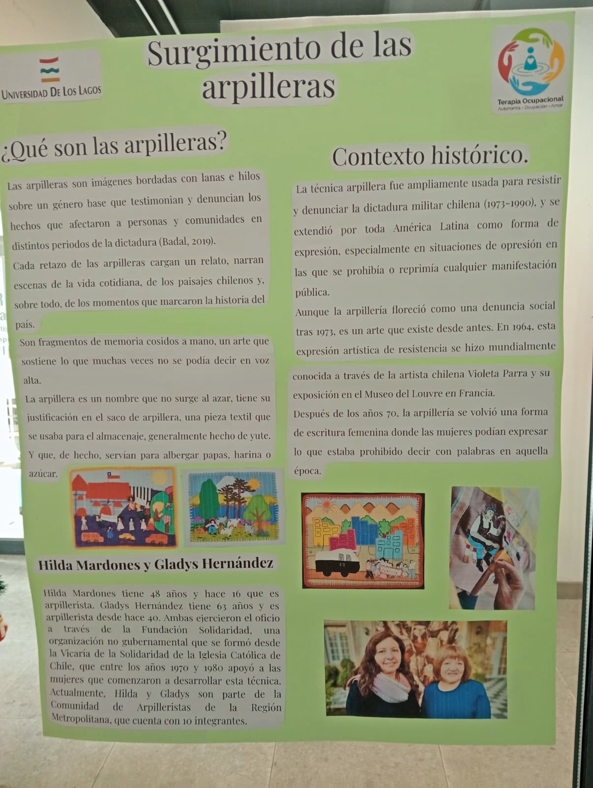 La actividad fue liderada por la académica Araceli Gallardo, quien comentó: “esta idea nació con la finalidad de que las y los estudiantes puedan conocer diferentes formas de intervención aparte de la clínica. En este caso, las arpilleras no solo son utilizadas como expresión artística sino como forma de resistencia, de participación comunitaria y de organización”.