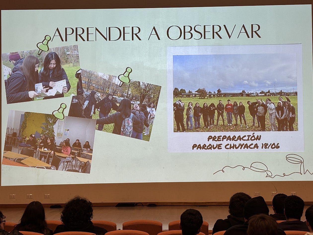 El desarrollo de la jornada, orientada a compartir con la comunidad universitaria las experiencias del proyecto “Monitoreo Ciudadano de la Biodiversidad en los Parques Urbanos de Osorno (2025)”, además de la presentación del documental, tuvo la participación de los profesores Gonzalo Mardones y Zamir Bugueño, quienes se refirieron a la iniciativa destacando el liderazgo, gestión y compromiso de las y los estudiantes.