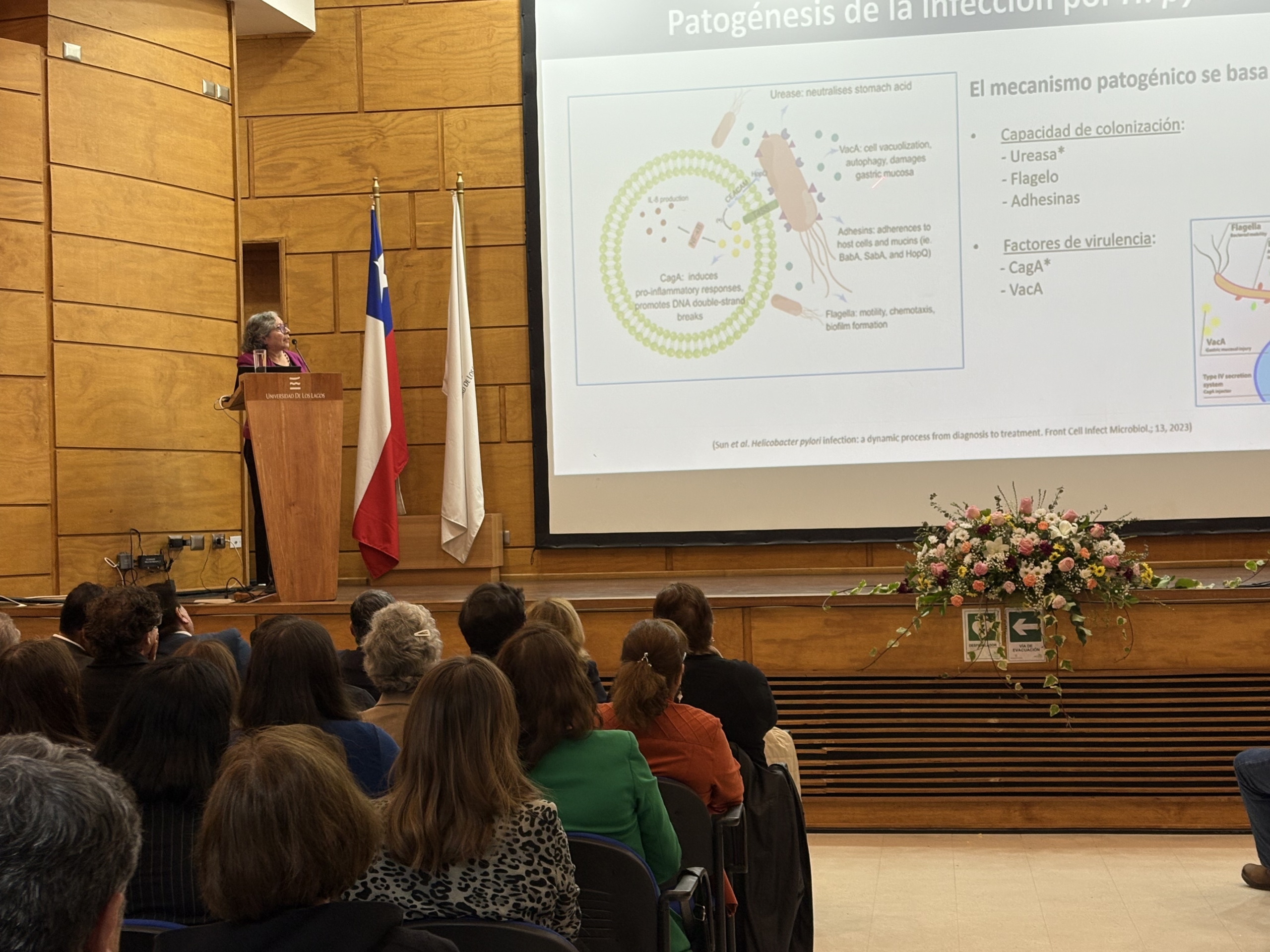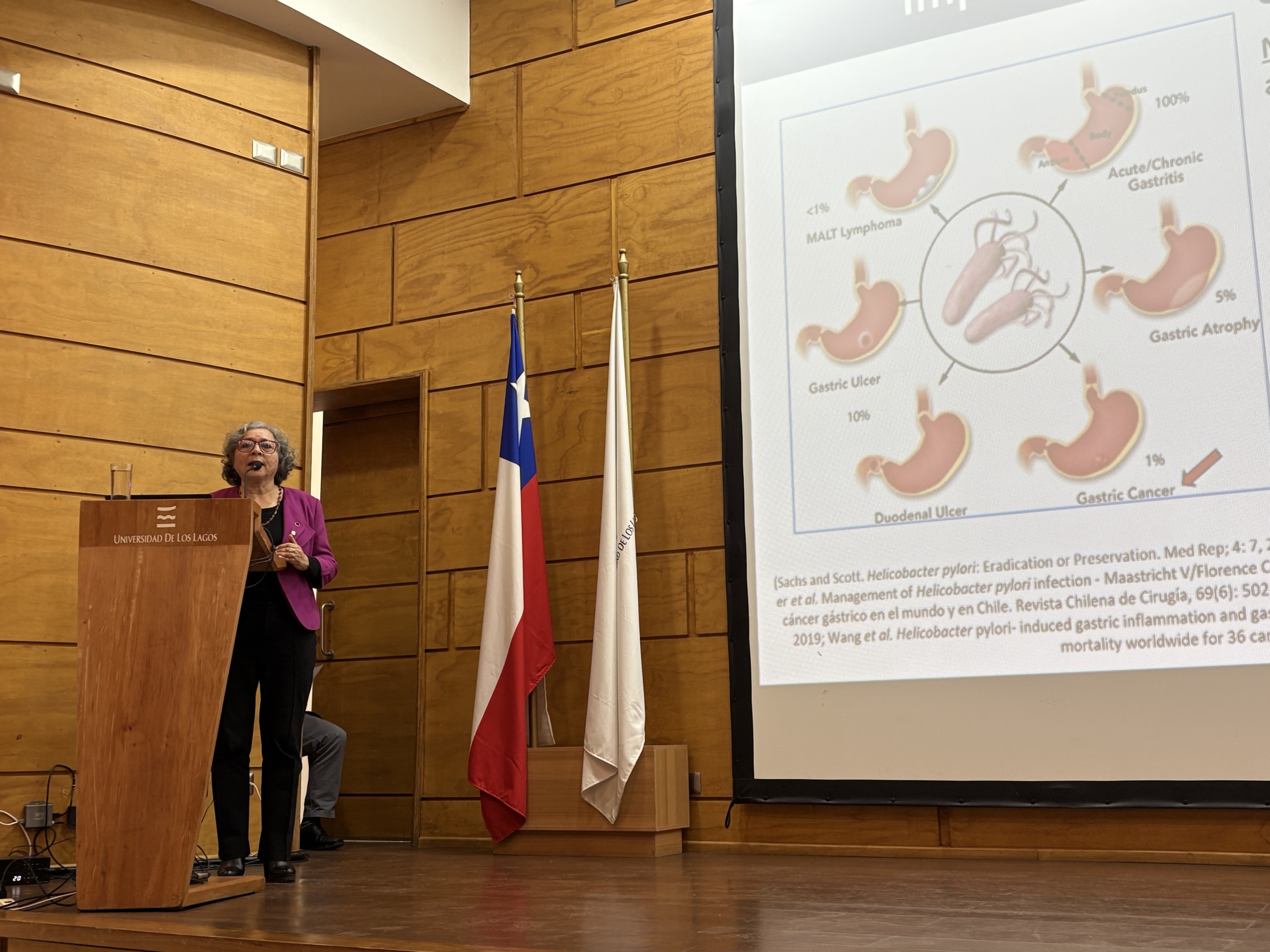 La Dra. Apolinaria García, investigadora de la Universidad de Concepción expuso sobre “Helicobacter pylori: sobre su resistencia, prevención y transmisión”, un tema que acaparó la atención de toda la comunidad universitaria que asistió hasta el auditorio Enrique Valdés, mientras que en campus y sedes seguían la transmisión en directo alrededor de 300 personas más.
