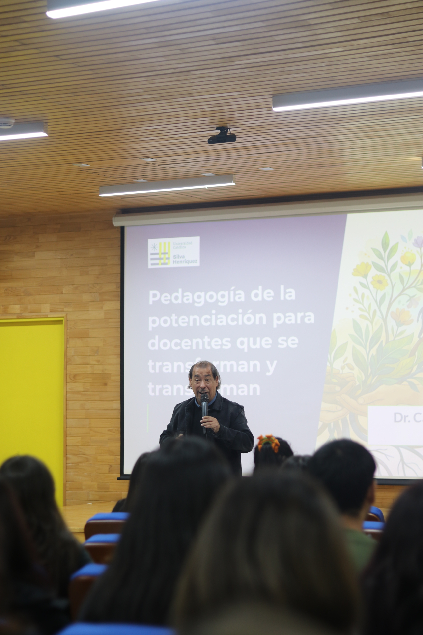 La actividad fue encabezada por el académico e investigador de la Universidad Católica Silva Henríquez, Dr. Carlos Bustos Reyes, especialista en formación docente, educación en derechos humanos, memoria e interculturalidad, quien compartió una mirada centrada en el desarrollo humano, el reconocimiento del territorio y la construcción de comunidades educativas más inclusivas.