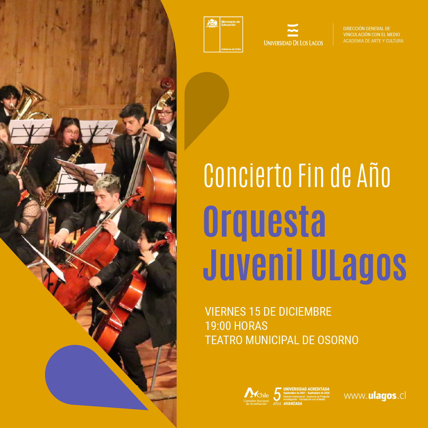La Orquesta Juvenil de la Universidad de Los Lagos cierra su año de presentaciones en grande con su Concierto de Fin de Año, el que se llevará a cabo este viernes 15 de diciembre en el Teatro Municipal de Osorno. En la ocasión, el elenco estudiantil repasará las obras más aclamadas durante el presente año y unas sorpresas de fin de año.