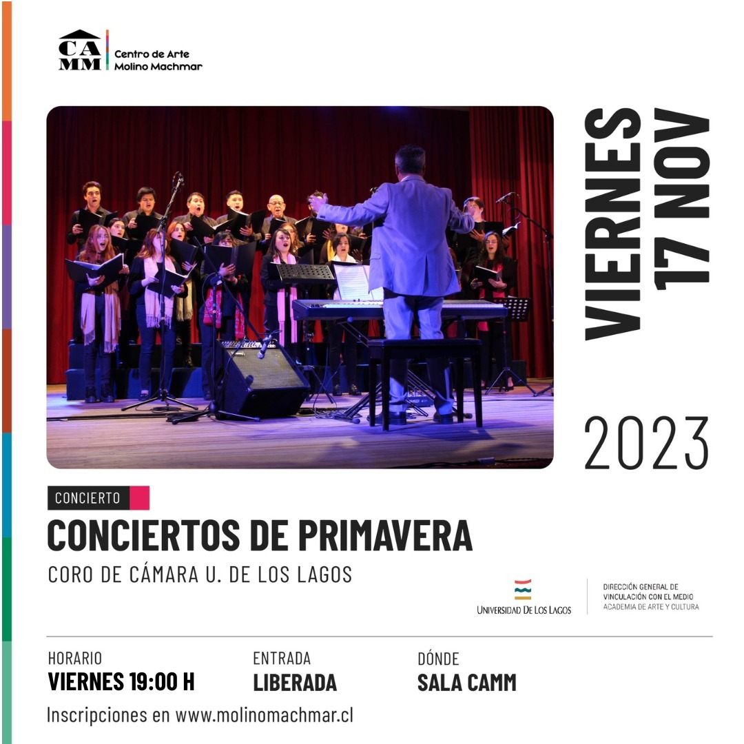 El Coro de Cámara de la Universidad de Los Lagos, dirigido por Andrés Pereira, continúa con su agenda de Conciertos de Primavera el próximo viernes 17 de noviembre en el Centro Arte Molino Machmar de Puerto Varas, para cautivar una vez más al público de nuestra región con su repertorio de clásicos y populares.
