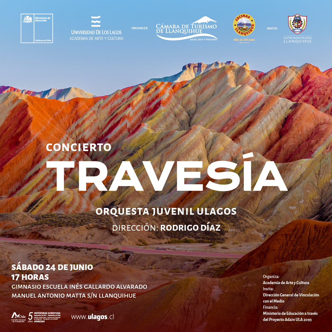 La Orquesta Juvenil de la Universidad de Los Lagos realizará este sábado 24 de junio una nueva presentación de su exitoso concierto «Travesía» en la ciudad de Llanquihue. El evento es organizado por la Cámara de Turismo de Llanquihue y cuenta con la colaboración de la Ilustre Municipalidad de Llanquihue. El concierto se realizará en el gimnasio de la Escuela Inés Gallardo Alvarado.