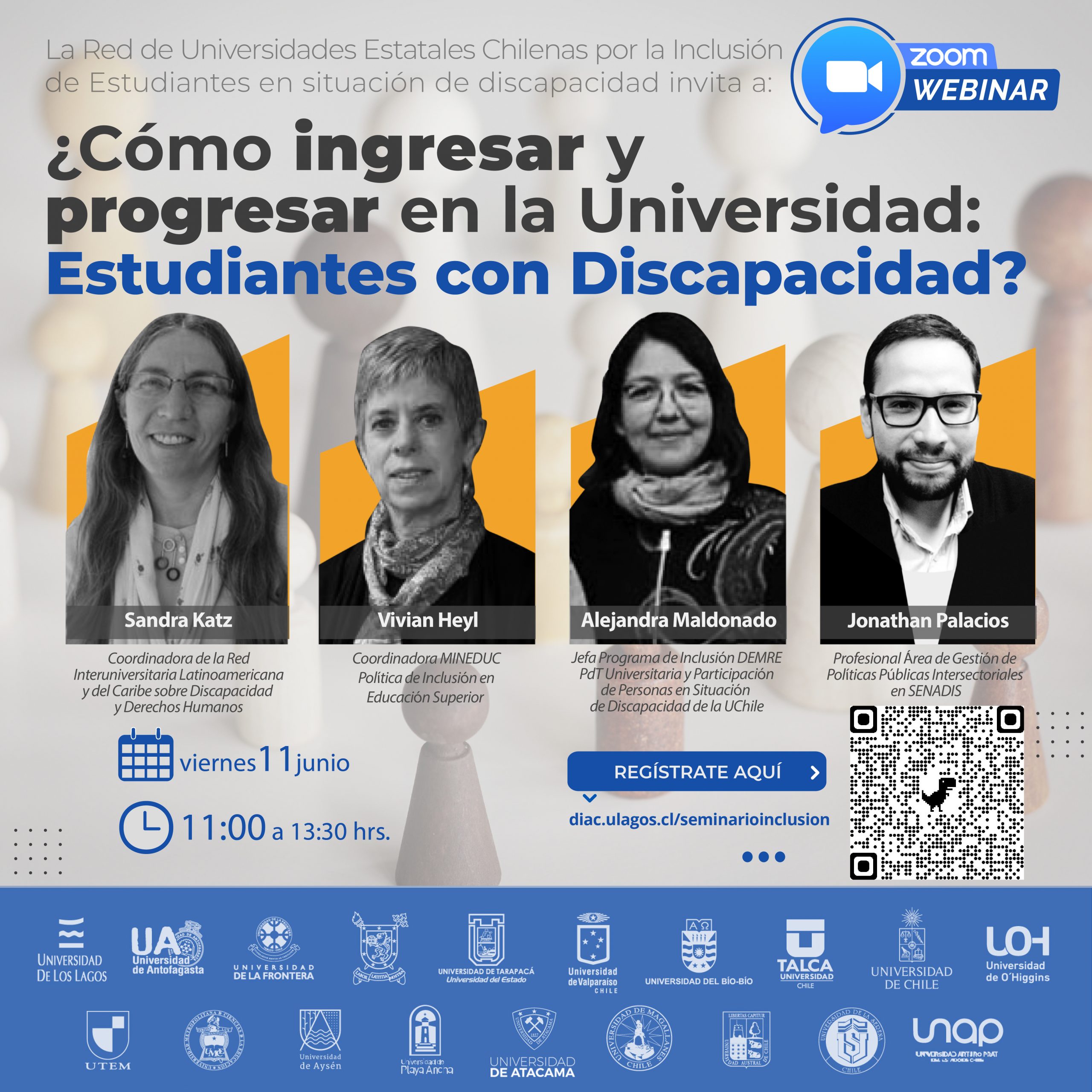¿Cómo ingresar y progresar en la Universidad: Estudiantes con Discapacidad? Es el nombre del conversatorio organizado por la Red de Universidades Estatales Chilenas por la Inclusión de Estudiantes en situación de discapacidad, de la cual forma parte la Universidad de Los Lagos. Evento que será transmitido vía Zoom.