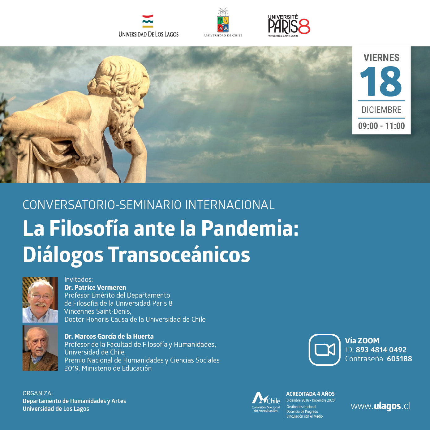 «La Filosofía ante la Pandemia: Diálogos Transoceánicos», es el nombre del conversatorio-seminario internacional, organizado por el Departamento de Humanidades y Artes de la Universidad de Los Lagos. Transmisión vía Zoom.