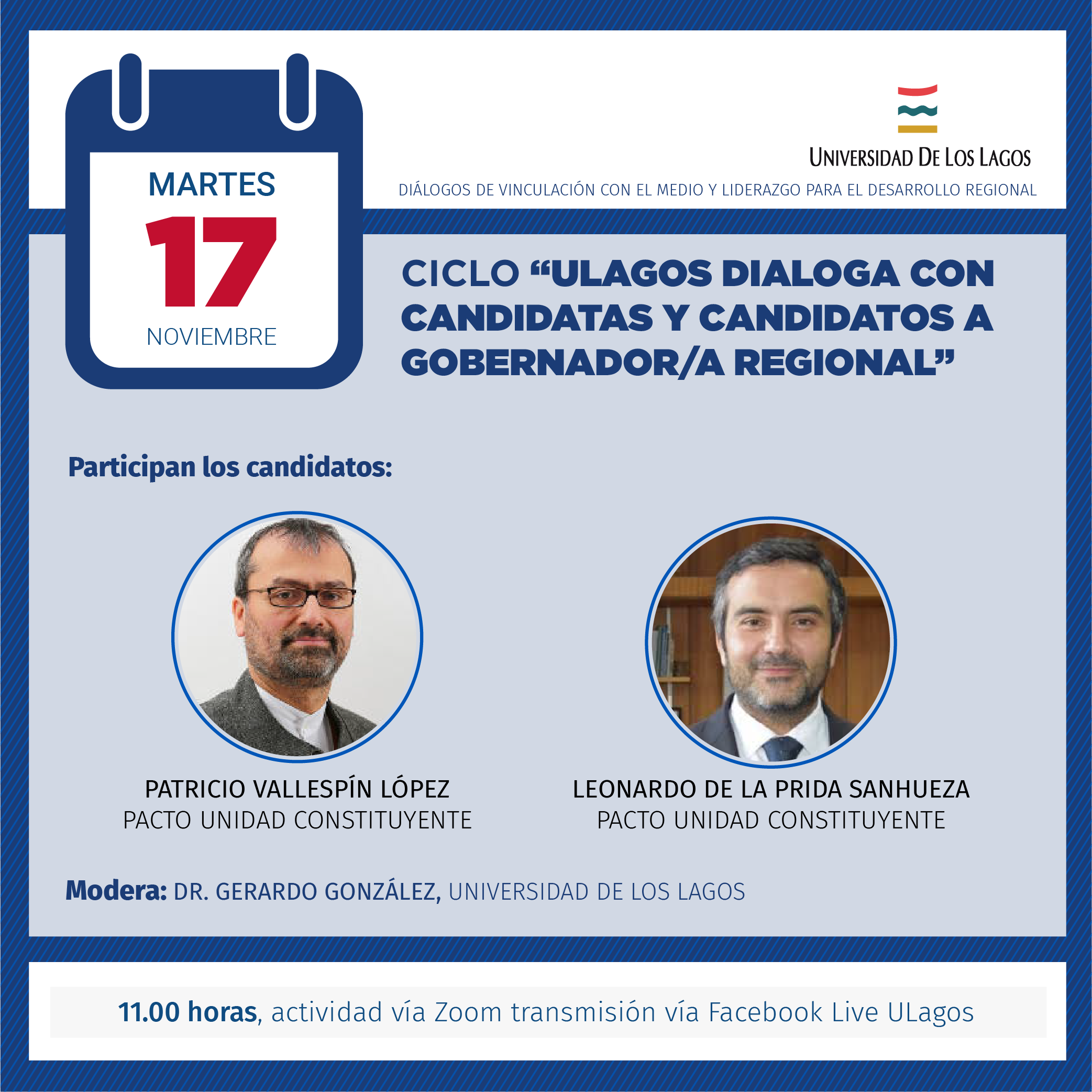 Ciclo «ULagos dialoga con candidatas y candidatos a gobernador/a regional». Este martes 17 de noviembre a las 11:00 horas, a través de Zoom y Facebook live ULagos.