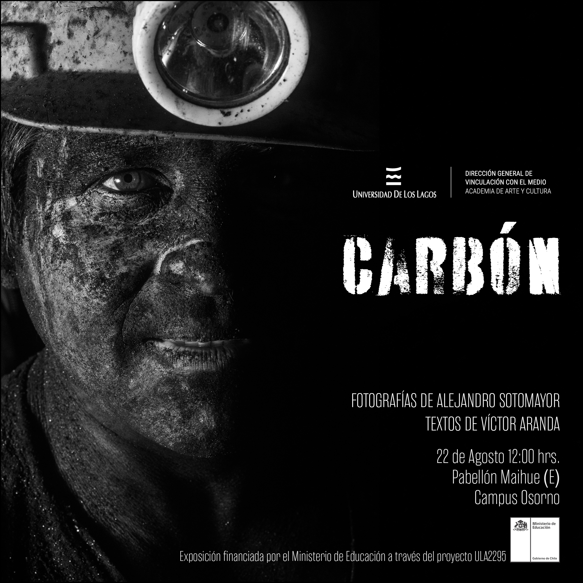 Óscar Garrido Álvarez, Rector de la Universidad de Los Lagos, y Gladys Moreno Schmidt, Directora de la Academia de Arte y Cultura, saludan muy atentamente a usted y tienen el agrado de invitarle a la inauguración de la Exposición Fotográfica “Carbón” del fotógrafo Alejandro Sotomayor. director de Caption Magazine,. Estas fotografías capturadas durante tres décadas en Lebu son el testimonio de una sacrificada forma de ganarse la vida de los últimos mineros del carbón en la provincia de Arauco.