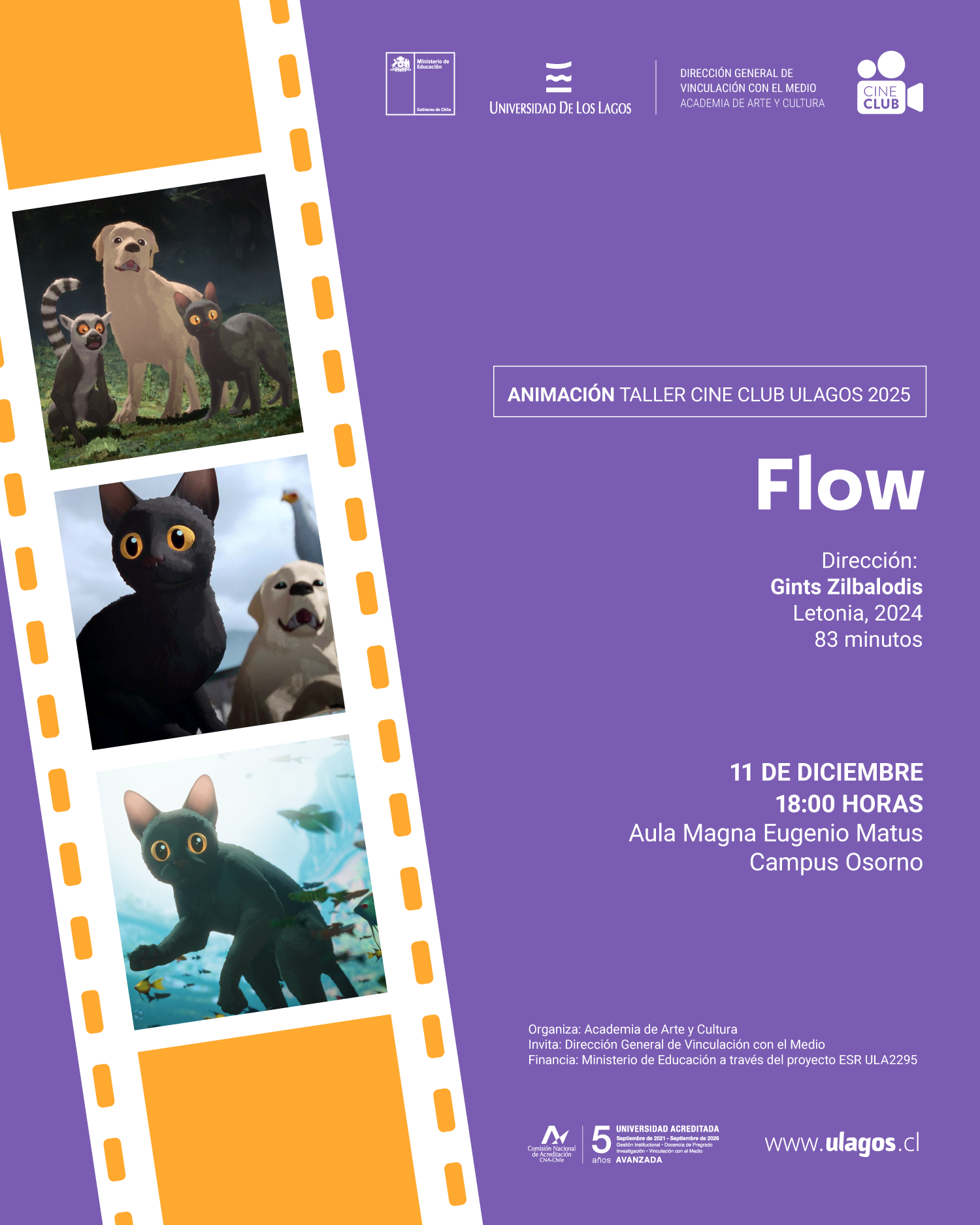 Finalizamos la temporada 2025 del Cine Club ULagos con una cinta inspiradora en la que los protagonistas son los animales. La sorprendente Flow (Letonia, 2024) ganadora del Oscar a mejor animación se llevó las loas de todo el mundo.