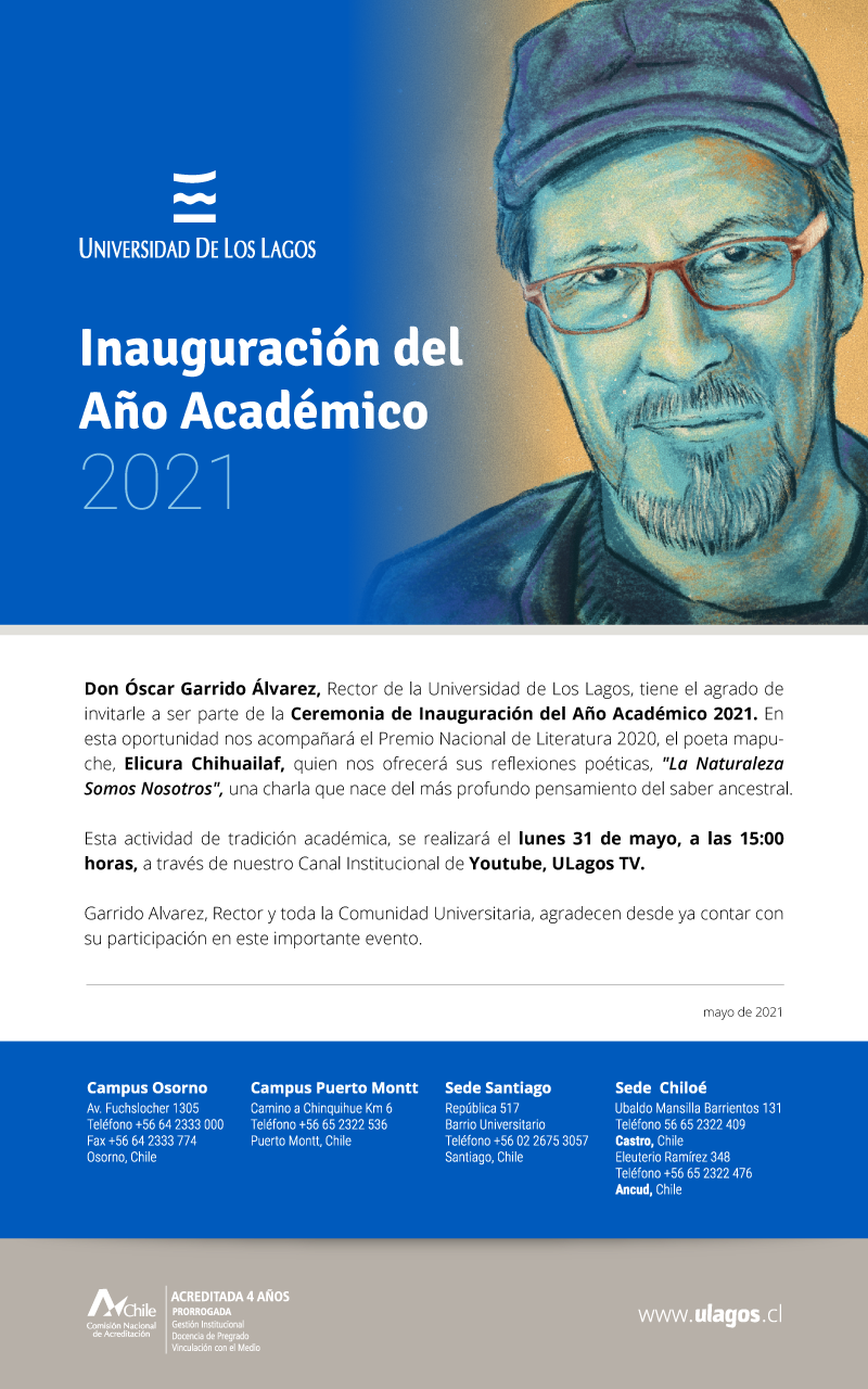 Ceremonia Inauguración año Académico 2021. El premio Nacional de Literatura 2020, poeta mapuche Elicura Chihuailaf, ofrecerá su reflexiones poéticas «La Naturaleza Somos Nosotros». El lunes 31 de mayo a las 15:00 horas, a través del canal institucional Youtube, ULagos TV.
