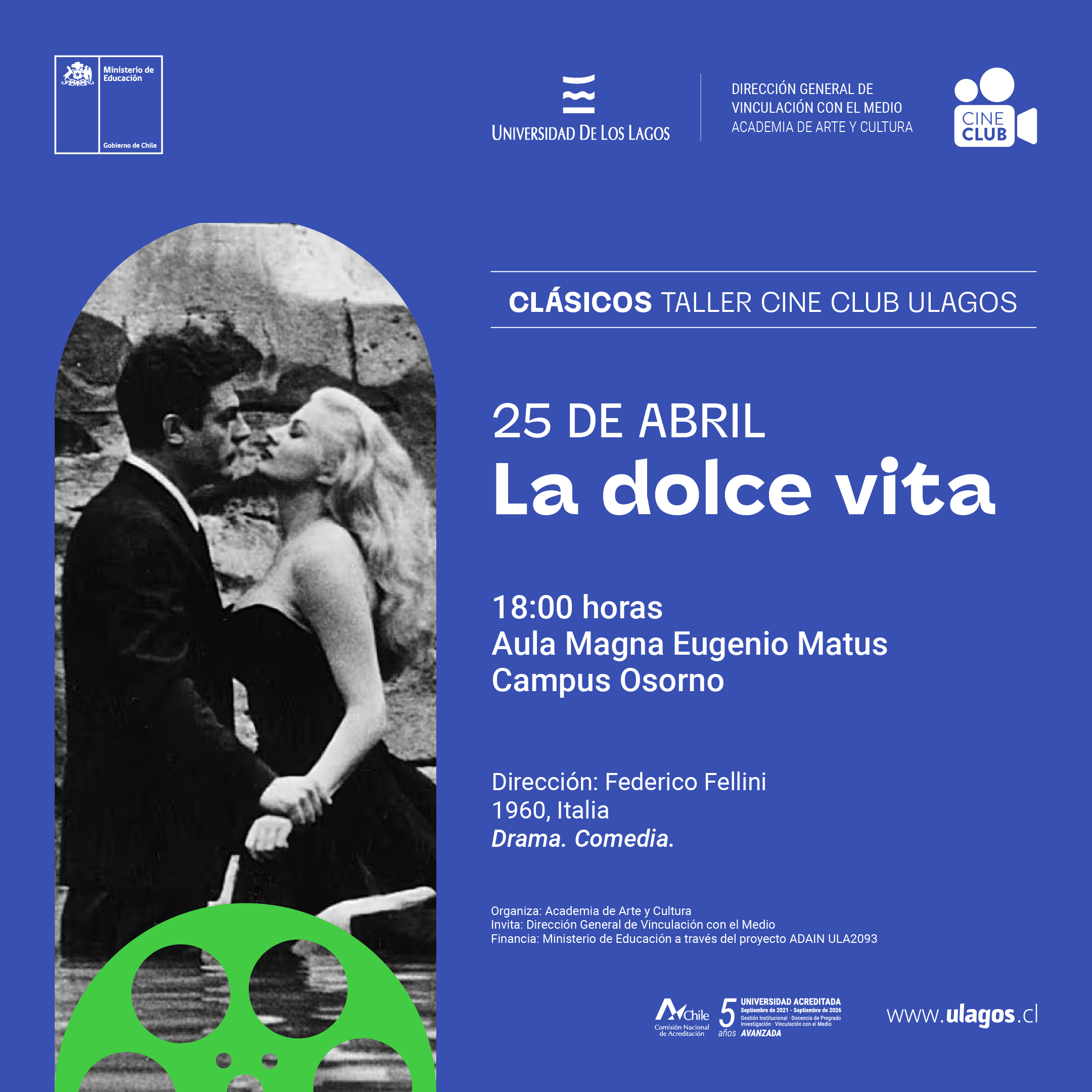 Este jueves 25 retornamos con el ciclo de Clásicos, con mayúscula. «La dolce vita» de Federico Fellini (1960) se presentará gratis a las 18:00 horas como es de costumbre en el Aula Magna.
