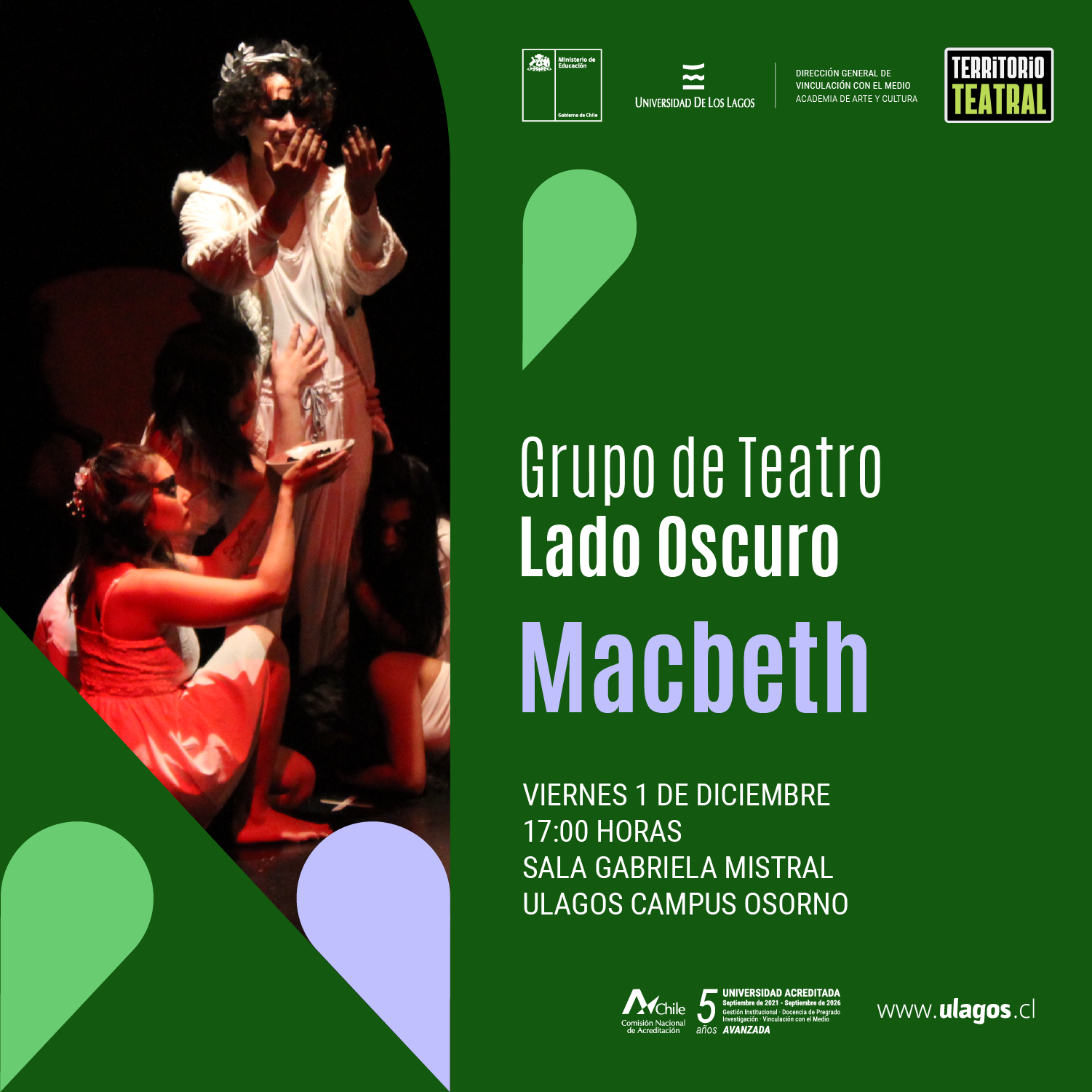 Este viernes 1 de diciembre el grupo Lado Oscuro de la Academia de Arte presentará en Avant Premier la obra «La tragedia de Macbeth» en la Sala Gabriela Mistral del Campus Osorno a partir de las 17:00 horas.