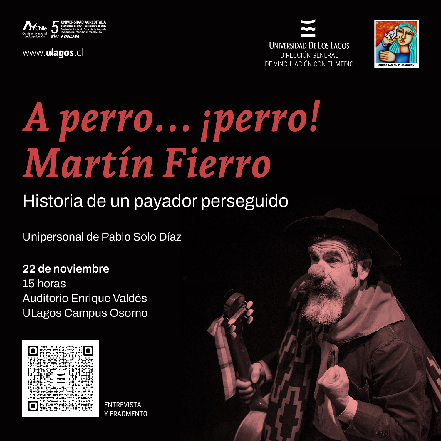 Queremos invitarles a la obra de teatro, A PERRO… ¡PERRO! MARTIN FIERRO, la historia de un payador perseguido, de Pablo Solo Díaz, un artista plástico, actor y titiritero.