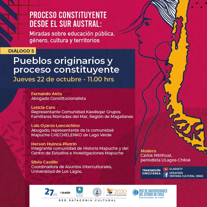 Este jueves 22 finaliza el ciclo de conversaciones en torno al Proceso Constituyente. En esta oportunidad abordaremos el tema Pueblos Originarios y Proceso Constituyente junto a Fernando Atria,  Abogado Constitucionalista; Leticia Caro, representante comunidad Kawésqar, Grupos Familiares Nómades del Mar; Luis Oyarzo Loncochino, Abogado, representante de la comunidad Mapuche CHCHELONCO de Lago Verde; Herson Huinca-Piutrin, integrante comunidad de Historia Mapuche y del Centro de Estudios e Investigaciones Mapuche; y Silvia Castillo, Coordinadora de Asuntos Interculturales ULagos.