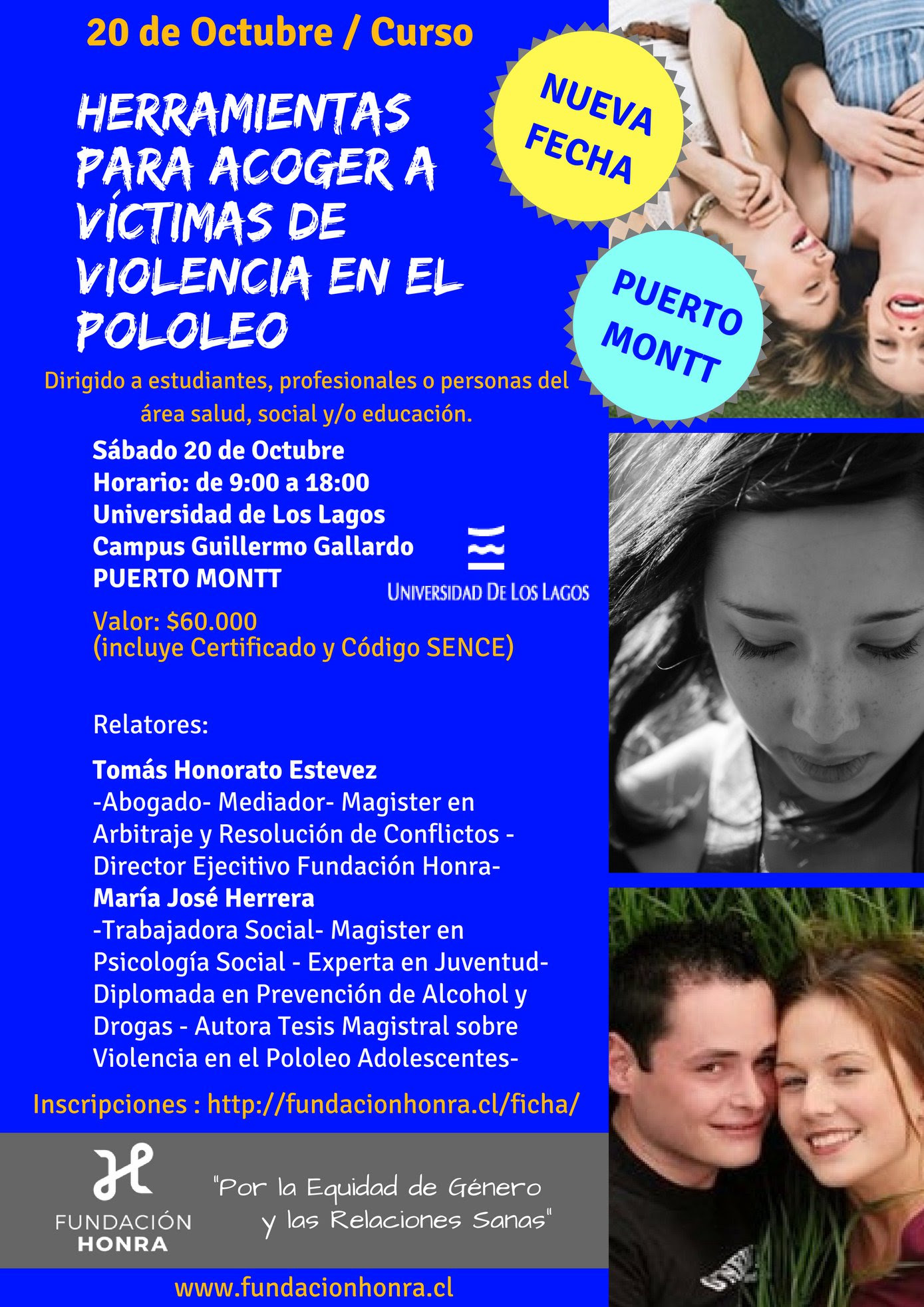 La Universidad de los Lagos y Fundación Honra, informan que se encuentran abiertas las inscripciones de la Primera Versión del curso presencial: «Herramientas para prevenir, detectar y acoger a jóvenes víctimas de violencia en el pololeo». Este curso se realizará el día sábado 20 de octubre de 9 a 18:00 hrs. en la Universidad de los Lagos, Puerto Montt.
